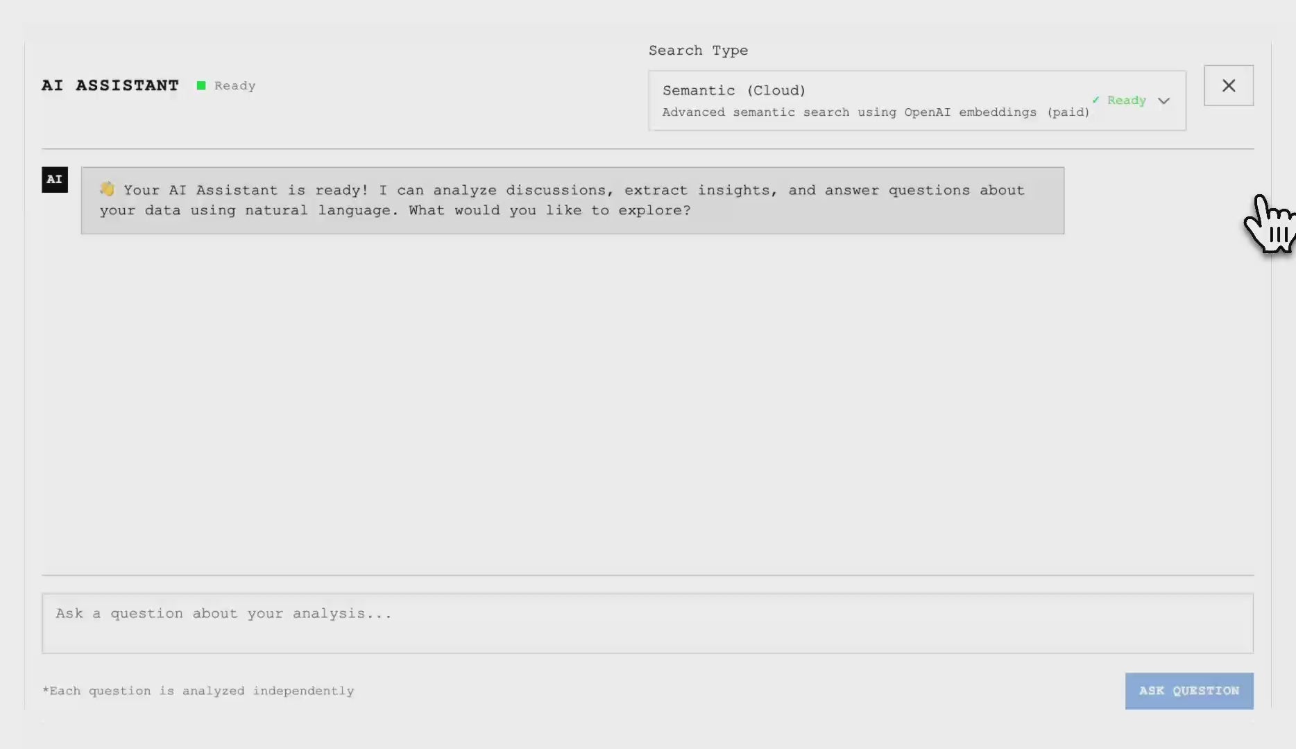 Ask questions in plain English like "What do people hate about meal planning apps?" and get evidence-backed insights immediately. The AI assistant searches through Reddit data finding relevant discussions and synthesizing them into actionable answers.