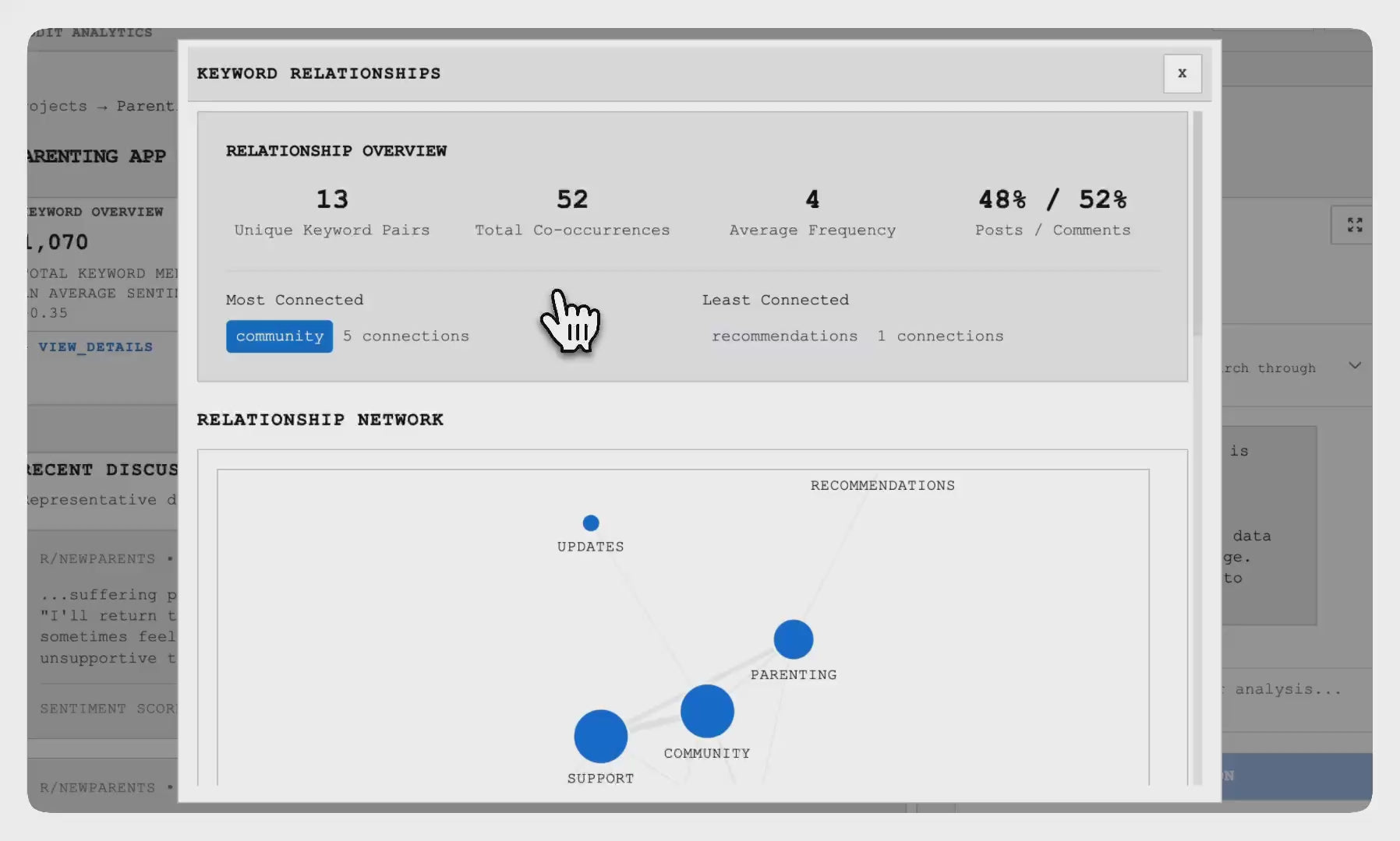 Discover which concepts appear together and how they trend over time. Sentopic reveals unexpected connections between keywords, then helps you confirm whether patterns are real or just noise.
