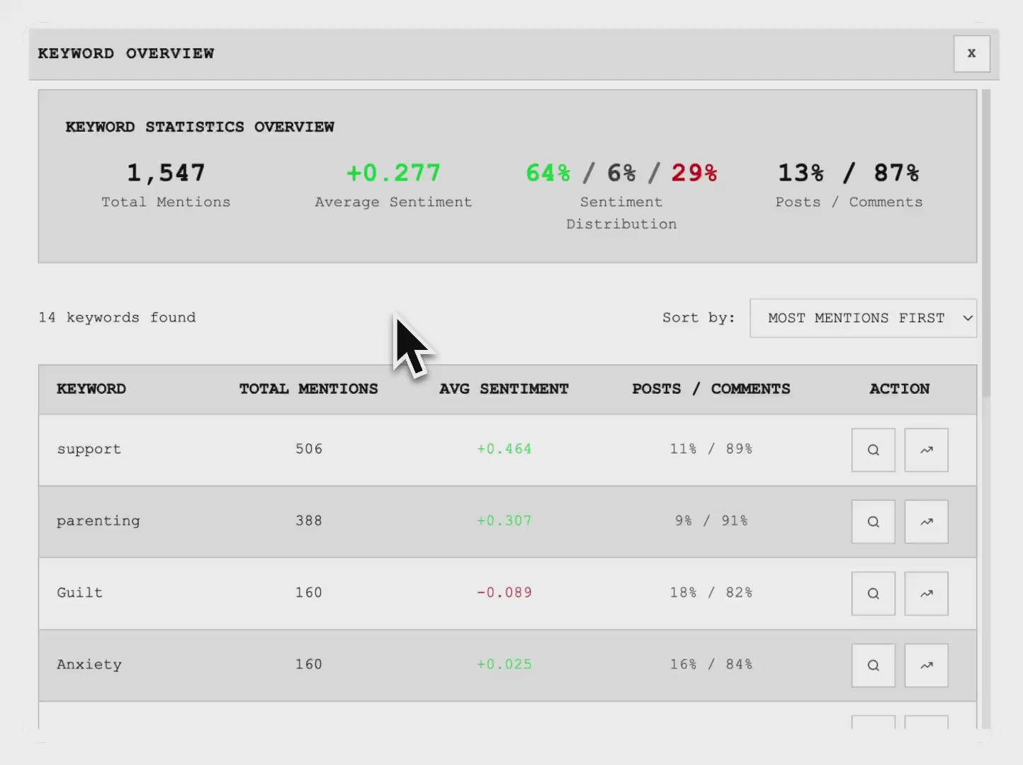 Start with the big picture: sentiment scores and mention counts across all your keywords. Spot which topics generate excitement and which spark frustration. Then dive into the actual conversations. See both the forest and the trees.